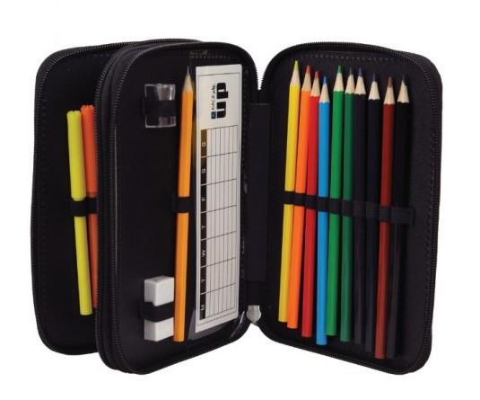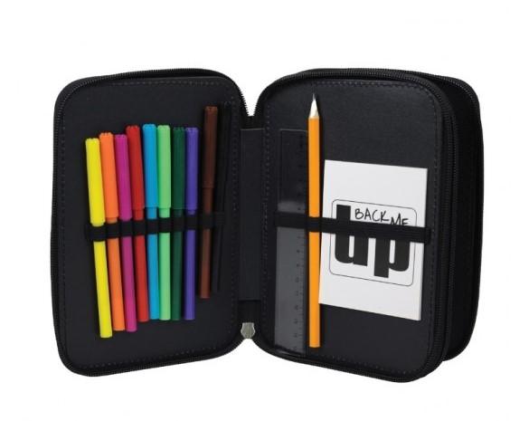Dvoupatrový penál s výbavou americké značky Back me up Unicorns are real. Rozměry: 18 x 15 x 4 cm. Materiál: polyester. Barva: černá. Včetně vnitřního vybavení. Obsah: 10 barevných tužek 10 barevných fixů 2 grafitové tužky 1 guma 1 pravítko 1 ořezávátko 1 poznámkový blok 1 rozvrh hodin Výrobce: Gimsa. Giovas S.A. Konopi 19400 Greece info@giovasgroup.com