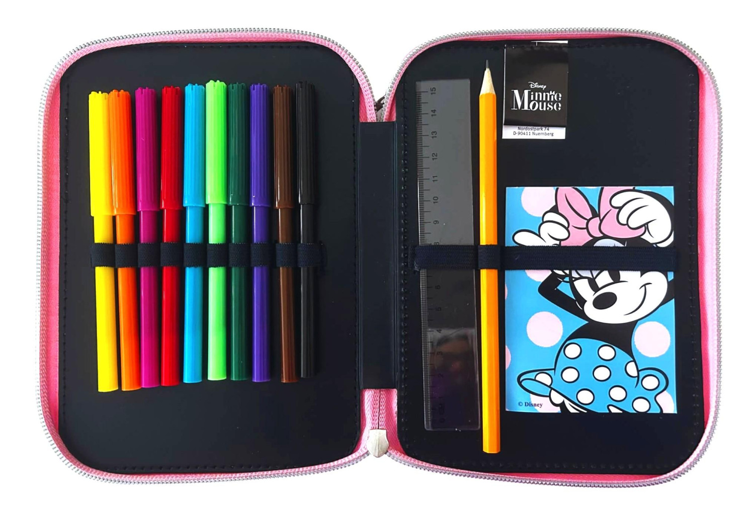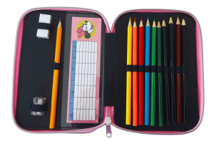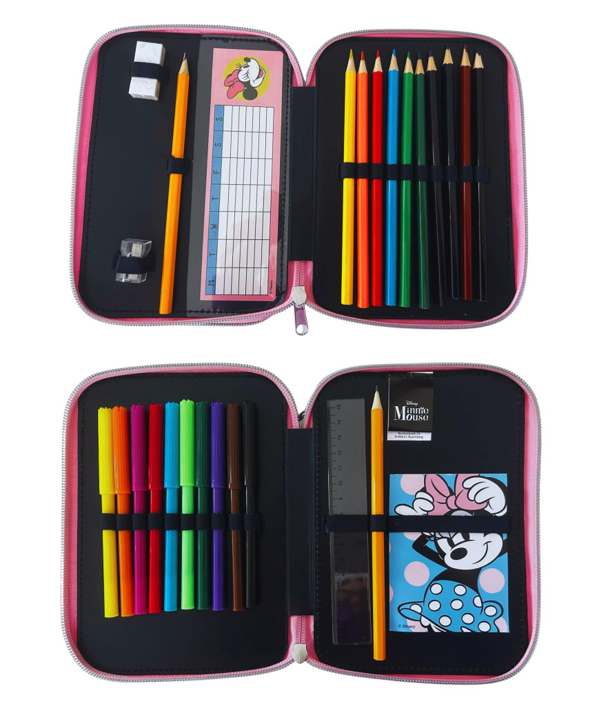 Dvoupatrový penál s výbavou s motivem Minnie. Rozměry: 18 x 15 x 4 cm. Materiál: polyester. Včetně vnitřního vybavení. Obsah: 10 barevných tužek 10 barevných fixů 2 grafitové tužky 1 guma 1 pravítko 1 ořezávátko 1 poznámkový blok 1 rozvrh hodin Výrobce: Gimsa. Giovas S.A. Konopi 19400 Greece info@giovasgroup.com