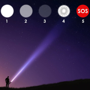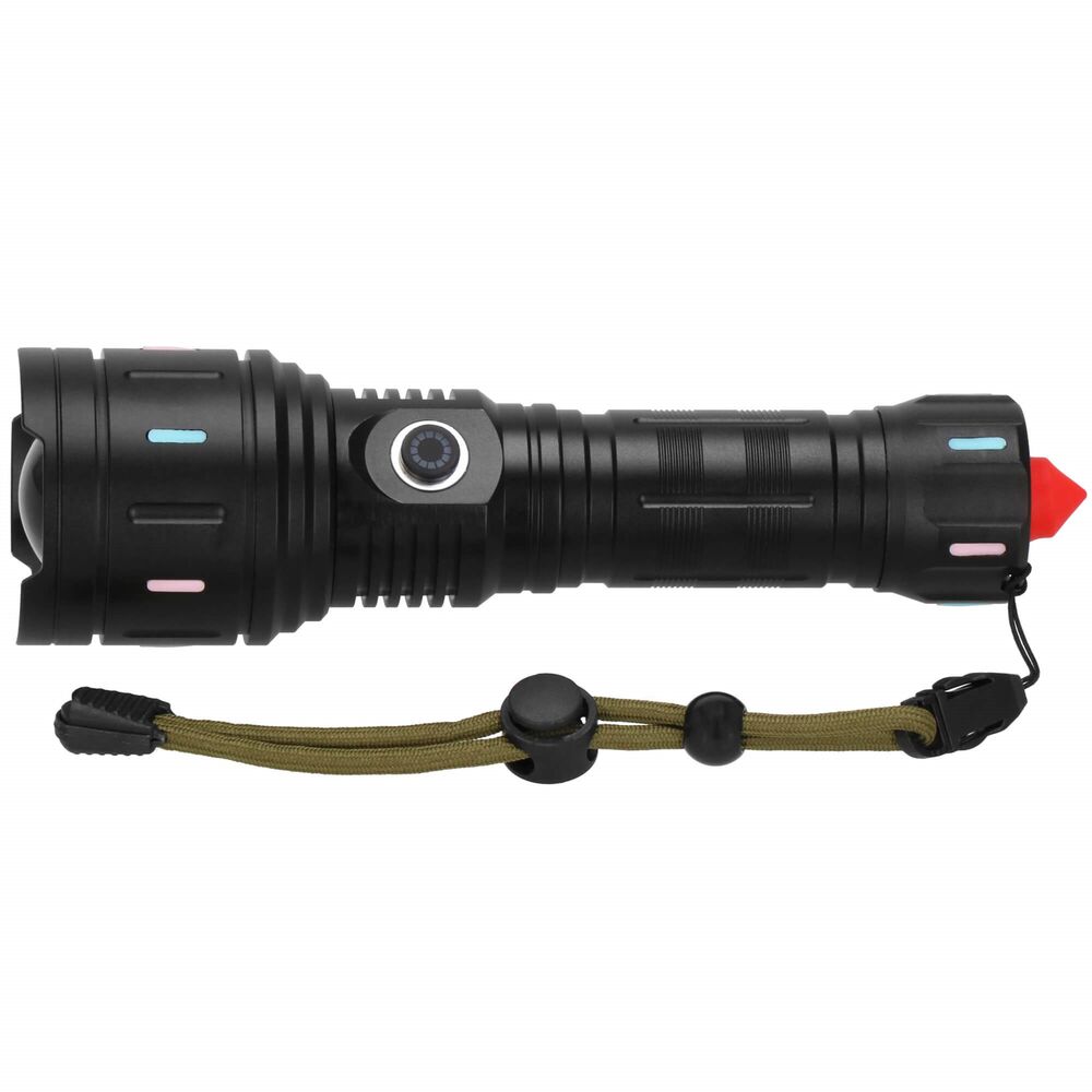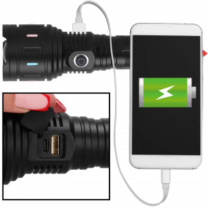 Dotaz na produktVýkonná LED dobíjecí baterka s odolným hliníkovým tělem, zoomem a 5 režimy svícení je ideální pro náročné použití. Nabízí studené bílé světlo s dlouhým a silným dosahem, možnost využití jako powerbanka díky baterii 5000 mAh a dvěma portům USB a USB-C. Rozbíjecí hrot na konci je chráněn krytem. Součástí balení je praktické poutko pro nošení. Rozměry 20x5 cm.