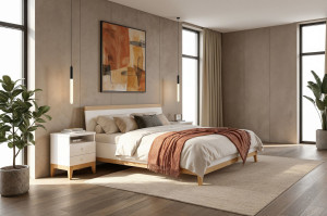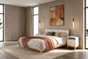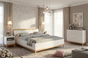 Postel Visby LIVIA zaujme zajímavou formou a módní kombinací bílé s přírodní barvou bukového dřeva. Postel má jednoduché vysoké čelo zakončené bukovým roštem. Dřevěné nohy ze 100% bukového dřeva podpírají korpus postele z masivního borovicového dřeva v bílé barvě. Lakování tohoto prvku je však neobvyklé, protože mění pouze barvu dřeva, ale nezakrývá jeho kresbu – pod vrstvou bílé jsou patrná zrna. Tento způsob povrchové úpravy dřeva umožňuje dosáhnout skvělého estetického efektu, daleko lepšího než běžný bílý deskový nábytek.