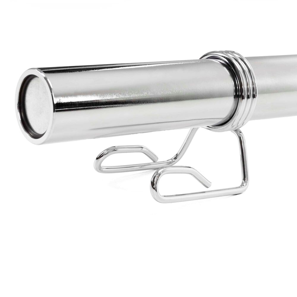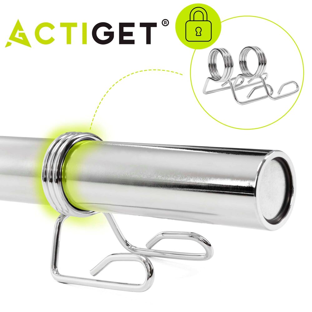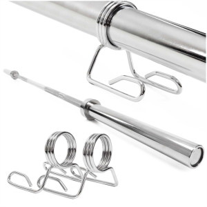 Tyč je vybavena protiskluzovými rukojeťmi, které zajišťují pevný a bezpečný úchop i při těžkých sériích. Součástí jsou také svorky na uchycení závaží, které zabraňují pohybu kotoučů během cvičení a zvyšují bezpečnost tréninku. Robustní konstrukce je navržena pro dlouhou životnost a pravidelné intenzivní používání.
