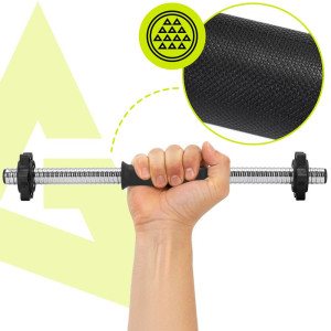 Osa je vybavena závitovými objímkami, které umožňují pevné a bezpečné upevnění kotoučů. Nakládací část o délce 16,5 cm poskytuje dostatek prostoru pro variabilní zátěž. Díky hmotnosti pouhých 0,5 kg je manipulace s osou velmi snadná, přesto nabízí nosnost až 50 kg. Vhodná pro domácí posilovnu i pravidelný kondiční trénink zaměřený na paže, ramena a horní část těla.