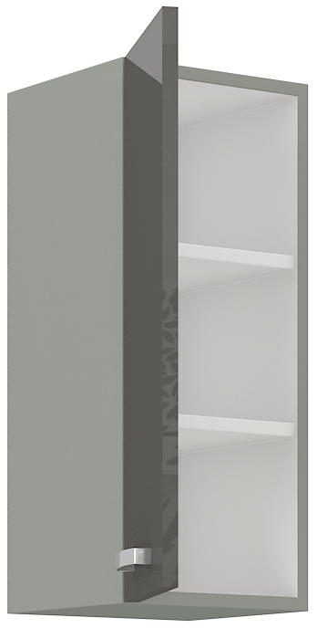 Horní skříňka jednodveřová GREY vyrobená z kvalitního lamina a MDF. Korpus je v barvě šedá a dvířka v barvě grey šedá v lesku. Rozměry skříňky - šířka 30 cm, výška 71,5 cm, hloubka 31 cm. Úchyty jsou z kovu. Dvířka mají levé otvírání. V naší nabídce naleznete další výběr skříněk k sestavení celé kuchyně.