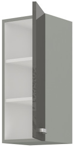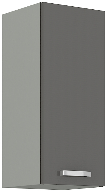 Horní skříňka jednodveřová GREY vyrobená z kvalitního lamina a MDF. Korpus je v barvě šedá a dvířka v barvě grey šedá v lesku. Rozměry skříňky - šířka 30 cm, výška 71,5 cm, hloubka 31 cm. Úchyty jsou z kovu. Dvířka mají pravé otvírání. V naší nabídce naleznete další výběr skříněk k sestavení celé kuchyně.