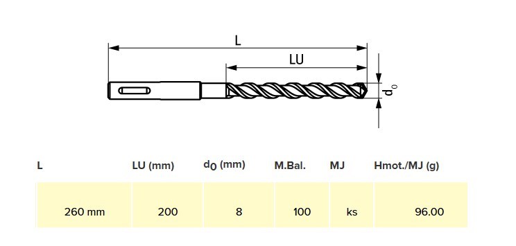 průměr 8 mmpracovní délka 200 mmcelková délka 260 mmVlastnosti produktumateriál vysoce kvalitní ocel se 2 vidiovými břity (z tvrdokovu)určený pro vrtání do dutých cihel a blokůminimalizuje poškození...