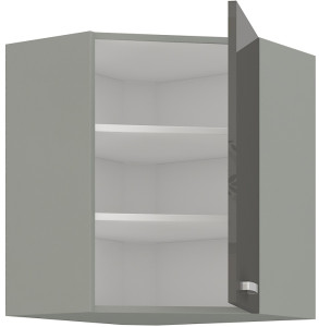 Horní skříňka rohová GREY vyrobená z kvalitního lamina a MDF. Korpus je v barvě šedá a dvířka v barvě grey šedá v lesku. Rozměry skříňky - šířka 59 x 59 cm, výška 71,5 cm, hloubka 31 cm. Úchyty jsou z kovu. Dvířka mají pravé otvírání. V naší nabídce naleznete další výběr skříněk k sestavení celé kuchyně.