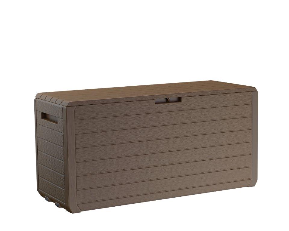 Hnědá barva s texturou imitace dřeva dodává boxu elegantní vzhled, který se hodí na terasu i do zahradního altánu. Díky odolnému materiálu a kvalitnímu zpracování si box zachová svůj vzhled i po letech používání.