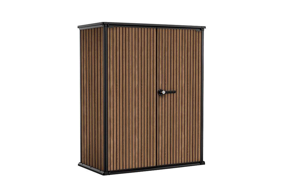 Zahradní box, technologie DecoCoat – odolnost vůči nepříznivým povětrnostním vlivům, rzi a hnilobě, snadná údržba, dvojité dveře, 2 police, struktura připomínající skutečné dřevo.