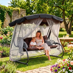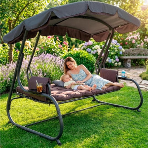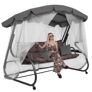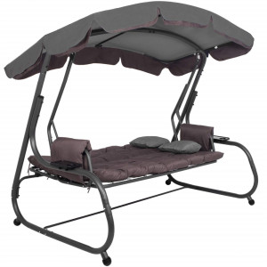 Zahradní houpačka 3-4 místná, hnědá SPRINGOS DIANA poskytuje velkorysý prostor pro odpočinek i společné chvíle. Díky funkci lůžka, pohodlnému podsedáku a dvěma polštářům si užijete relaxaci na maximum. Praktické držáky nápojů zvyšují pohodlí při každém posezení.