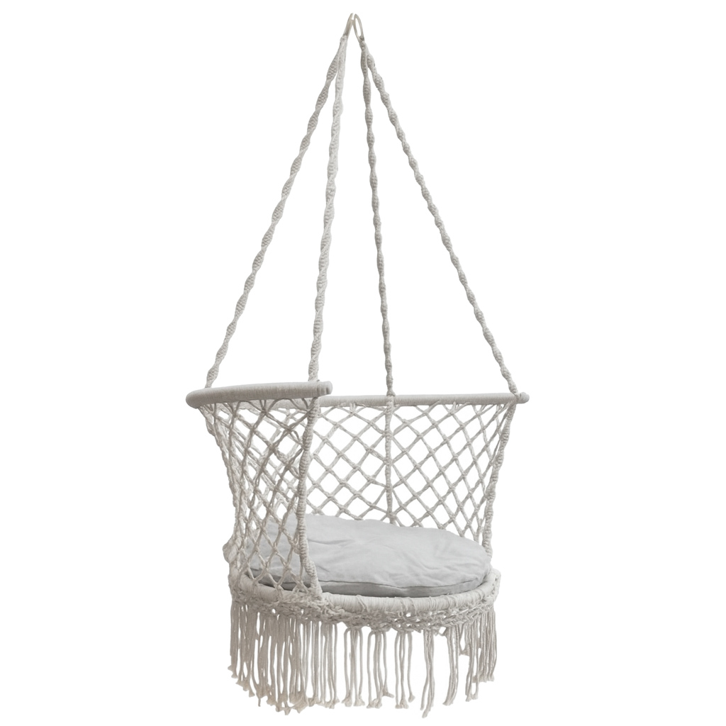 Na houpačce můžete sedět vzpřímeně nebo po turecku - vyvážená konstrukce minimalizuje riziko pádu. Klasické barevné provedení v kombinaci s boho designem se skvěle hodí do moderního i rustikálního prostředí.