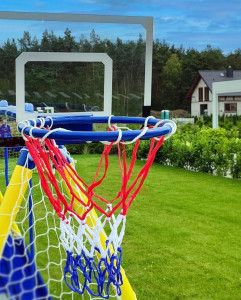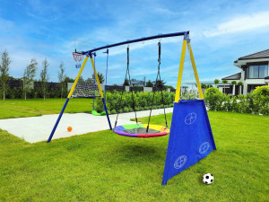 Proměňte svou zahradu v zábavné dětské hřiště s touto multifunkční houpačkou SEDCO KSW007 4v1! Tato robustní a stylová houpačka je navržena pro maximální zábavu a bezpečnost vašich dětí. Zahraní houpačka nabízí 2 samostatná "houpadla" různých druhů. Menší zelená houpačka belt-swing má nosnost až 45 kg. Je tak vhodná pro děti ve věku 3-8 let. Větší kulatá houpačka unese děti nebo dospívající až do hmotnosti 75 kg. Je tak vhodná pro všechny možné věkové kategorie. Součástí multifunkční houpačky KSW007 je i basketbalový koš a modrý boční potah s kresbou terčů a bodovým ohodnocením. K těmto doplňkům najdete v sadě i 2 nafukovací balóny s designem basketbalového a fotbalového míče. Celý tento multifunkční set tak nabízí nespočet způsobů, jak si hrát. Zahradní houpačka je proto ideální pro děti všech věkových kategorií a díky snadnému sestavení se stane okamžitým hitem na každé zahradě. Forma A ocelové konstrukce zajišťuje stabilitu a je odolná vůči povětrnostním vlivům, což zaručí dlouhou životnost a bezpečnost při používání.