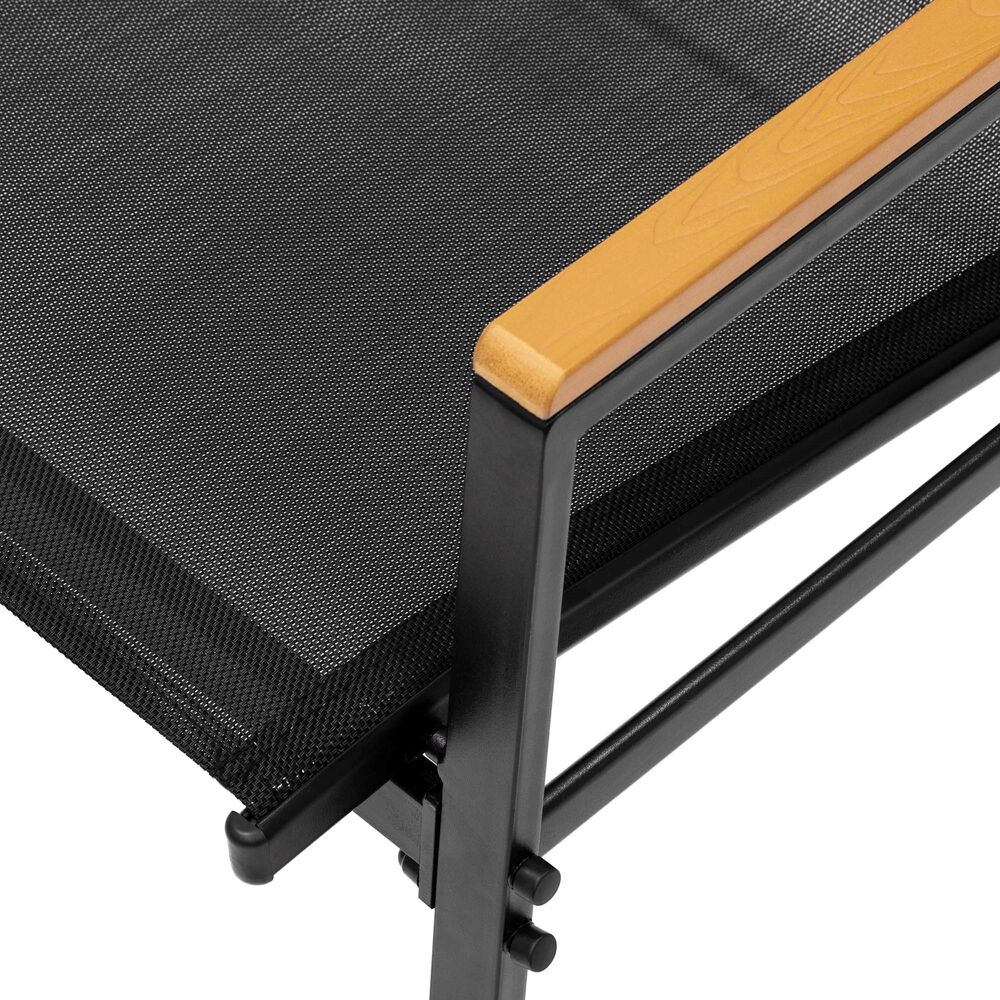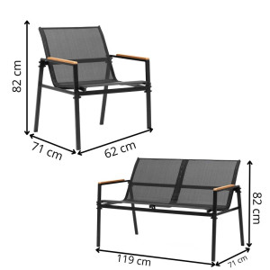 Dotaz na produkt Na splátky ještě dnesElegantní zahradní sestava pro pohodlné posezení až pro 4 osoby. Obsahuje konferenční stůl s černou skleněnou deskou z bezpečnostního skla, sedačku pro 2 osoby a 2 stohovatelná křesla. Prodyšné sedáky, vyšší opěrky zad a pohodlné područky zajišťují komfort. Stabilní kovová konstrukce odolává vodě i povětrnostním vlivům, ideální pro dlouhodobé venkovní využití. Rozměry stolu 82x38,5 cm, šířka sedačky 104,5 cm, šířka křesla 51 cm.