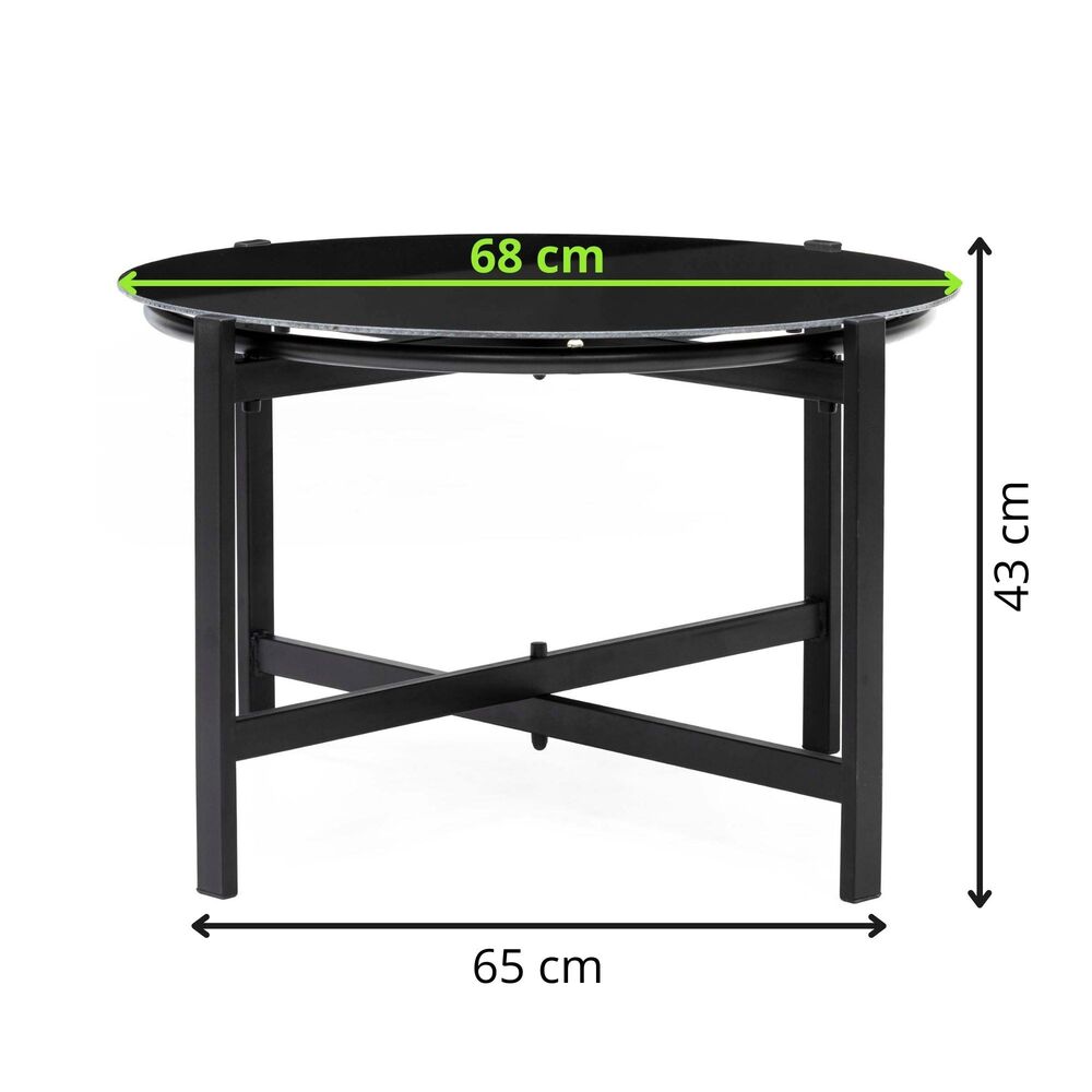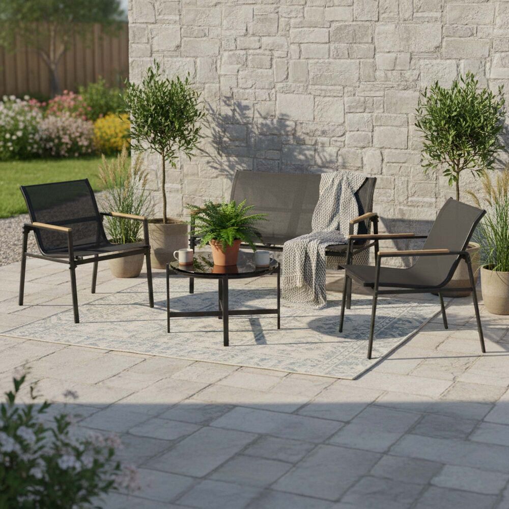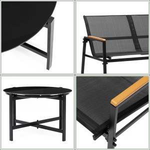 Elegantní zahradní sestava pro pohodlné posezení až pro 4 osoby. Obsahuje konferenční stůl s černou skleněnou deskou z bezpečnostního skla, sedačku pro 2 osoby a 2 stohovatelná křesla. Prodyšné sedáky, vyšší opěrky zad a pohodlné područky zajišťují komfort. Stabilní kovová konstrukce odolává vodě i povětrnostním vlivům, ideální pro dlouhodobé venkovní využití. Rozměry stolu 82x38,5 cm, šířka sedačky 104,5 cm, šířka křesla 51 cm.