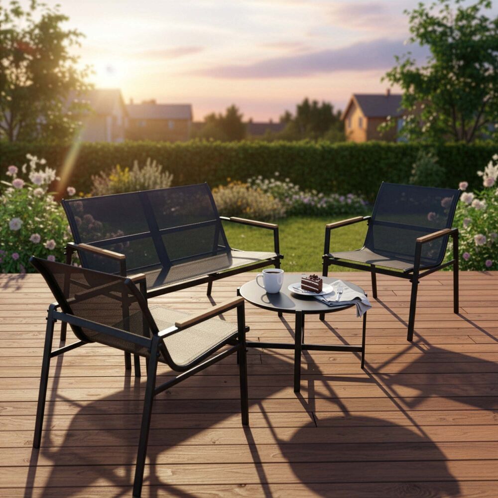 Set zahradního nábytku SPRINGOS GF0120 v elegantní černé barvě nabízí ideální řešení pro venkovní posezení. Sestava obsahuje konferenční stůl s černou skleněnou deskou z nerozbitného bezpečnostního skla, sedačku pro 2 osoby a dvě pohodlná křesla. Díky prodyšným sedákům, vyšším opěrkám zad a pohodlným područkám poskytuje maximální komfort při relaxaci na zahradě, terase nebo balkoně.