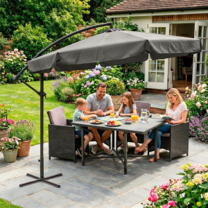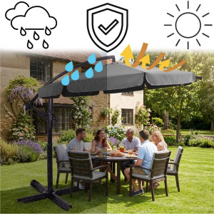 Slunečník je vybaven voděodolným materiálem s UV filtrem, který chrání před sluncem i lehkým deštěm. Možnost nastavení výšky a úhlu sklonu zajišťuje maximální flexibilitu. Ovládání usnadňuje klikový mechanismus a součástí balení je i ochranný kryt pro uskladnění.