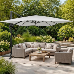 Velký obdélníkový slunečník o rozměrech 290×390 cm, průměr 485 cm poskytne spolehlivý stín i na větší ploše. Snadné ovládání, nastavitelná výška a sklon stříšky, otáčení pomocí nožního pedálu a robustní skládací mechanismus zajišťují pohodlné použití. Odolný vůči vodě, UV záření i povětrnostním vlivům, ventilační otvory pro lepší proudění vzduchu. Stabilní základna a kryt v ceně.