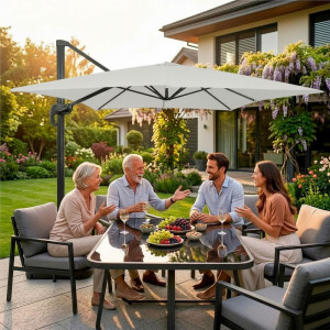 Zahradní slunečník 290x390 cm SPRINGOS GU0048 ve světle šedém provedení je ideální volbou pro ty, kteří hledají spolehlivé a elegantní zastínění větších venkovních ploch. Díky velkému obdélníkovému tvaru poskytuje dostatek stínu nad jídelním stolem, lehátky nebo posezením. Nastavitelná výška a sklon stříšky, spolu s možností otáčení pomocí nožního pedálu, umožňují přizpůsobit polohu slunečníku podle aktuální potřeby.