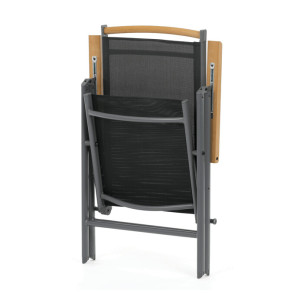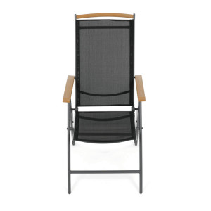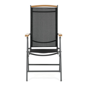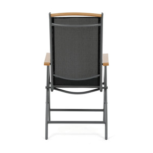 Zahradní židle se sklápěcí funkcí nabízí kombinaci pevné hliníkové konstrukce s práškovou povrchovou úpravou a pohodlného textilního sedáku a opěráku v šedé barvě. Opěradlo je nastavitelné, což umožňuje individuální přizpůsobení úhlu sklonu pro maximální komfort při relaxaci. Dřevěné polywoodové područky v přírodní barvě dodávají židli elegantní vzhled a příjemný dotek. Díky skládacímu mechanismu je snadné židli přenášet i skladovat. Stabilita a odolnost jsou zajištěny kvalitním materiálem a konstrukcí vhodnou pro venkovní použití.