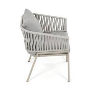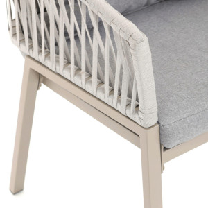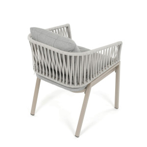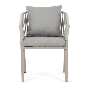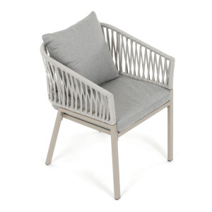 Zahradní židle v béžovém provedení spojuje stabilní kovovou podnož s pohodlným sedákem a opěradlem potaženým látkou v příjemném odstínu. Nadčasový design s jemnými liniemi a otevřenou konstrukcí opěradla vytváří vzdušný vzhled vhodný pro různé venkovní prostory. Židle je navržena tak, aby poskytovala komfort při posezení na terase, zahradě či balkóně, přičemž pevná kovová podnož zajišťuje dlouhodobou stabilitu a odolnost vůči povětrnostním vlivům. Látkový potah je příjemný na dotek a snadno se udržuje, což přispívá k praktickému využití v exteriéru. Celková konstrukce podporuje pohodlnou ergonomii a umožňuje relaxaci v přírodním prostředí.