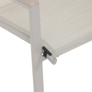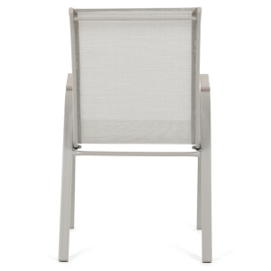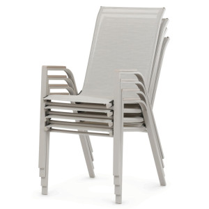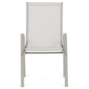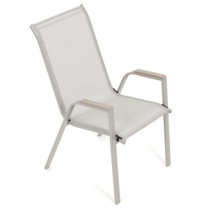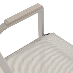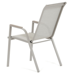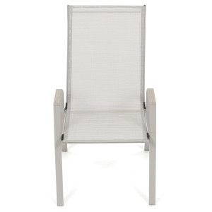 Zahradní židle v béžovém provedení kombinuje pevný rám s polywoodovými područkami v dekoru dubu, které dodávají přírodní vzhled a snadnou údržbu. Sedák a opěradlo jsou potažené odolnou síťovinou, která je příjemná na dotek a umožňuje pohodlné sezení i během teplých dnů díky své prodyšnosti. Konstrukce židle je navržena tak, aby byla stohovatelná, což usnadňuje její skladování a manipulaci. Stabilní kovová podnož zajišťuje bezpečné a pevné opření na různých površích. Díky kombinaci materiálů a designu je židle vhodná pro venkovní použití na terasách, zahradách či balkonech.