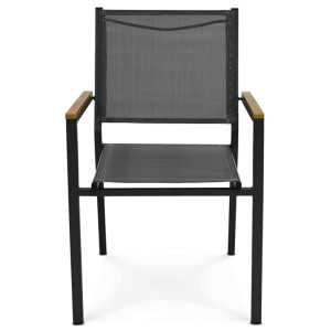 Dotaz na produktZahradní židle s kovovým rámem v šedé barvě nabízí pevné a stabilní provedení vhodné pro venkovní použití. Sedák a opěradlo jsou potažené odolnou textilií, která zajišťuje pohodlí a snadnou údržbu. Přírodní polywoodové područky přidávají židli příjemný estetický kontrast a zároveň komfort při sezení. Díky možnosti stohování je židle praktická pro skladování a úsporu místa. Je ideální volbou pro zahradní posezení, terasy či balkony.