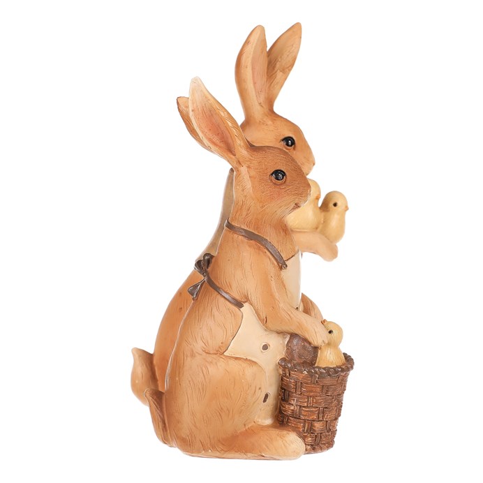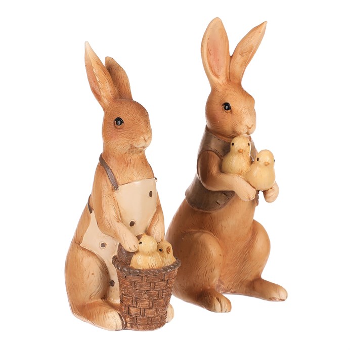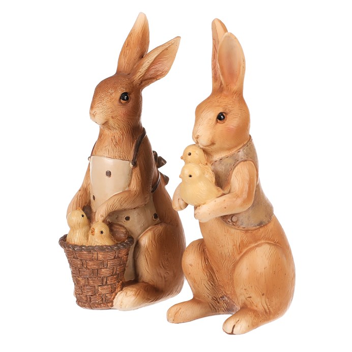 Dotaz na produkt Na splátky ještě dnesDva něžní zajíčci s kuřátky přinášejí velikonoční atmosféru plnou radosti. Jeden z roztomilých ušáků má své malé přátele v košíku, druhý si je něžně drží v rukou. Pečlivě zpracované figurky dodají vašemu interiéru špetku jarní svěžesti a rozveselí každý kout. Perfektní doplněk na poličku nebo stůl, který vykouzlí úsměv každému návštěvníkovi.