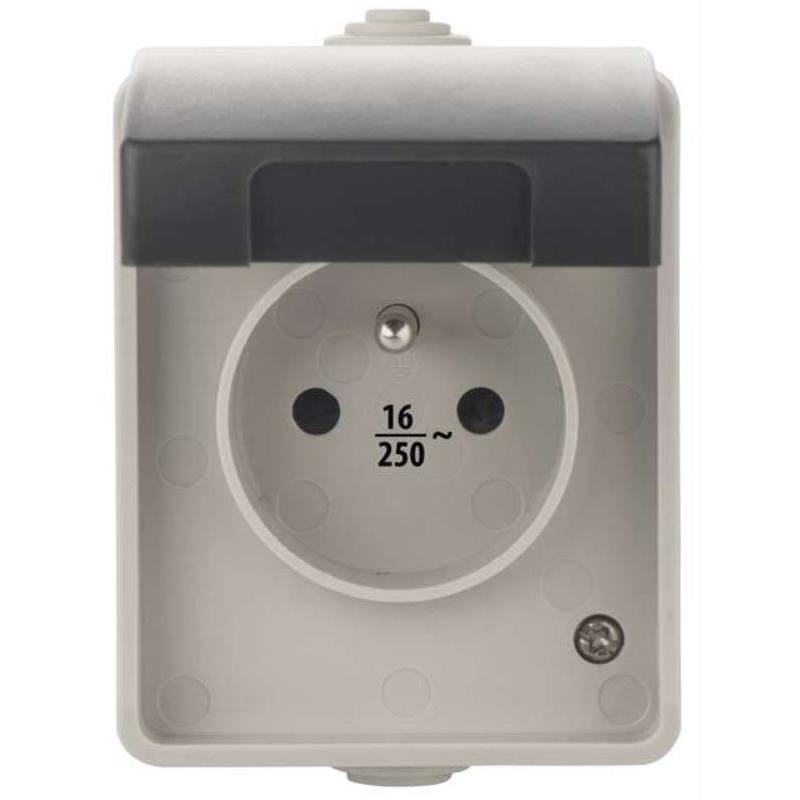 produkt: zásuvka s ochranným kolíkem a víčkemdesign: FRENCHtyp: 250 V~/16 A max.barva: šedo-černázpůsob montáže: na stěnukrytí: IP54provedení: 1 nás. voděodolnáprodejní obal: 1 ks, PE sáček