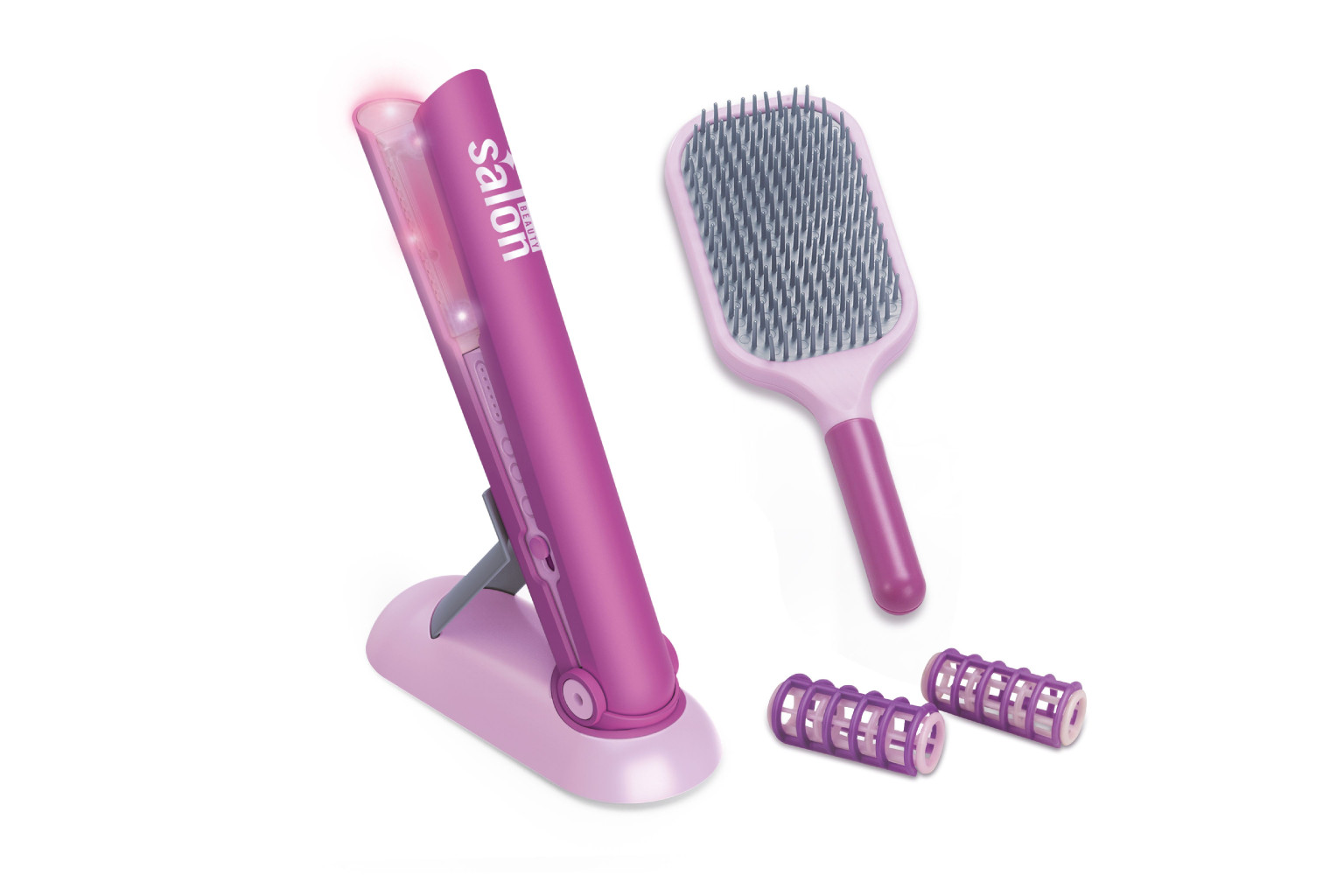 Dotaz na produktŽehlička na vlasy. Velikost žehličky 19cm. Obsahuje: kulmu, kartáč na vlasy, natáčky, stojánek na kulmu. Zvukové a světlené efekty. 2xAAA baterie nejsou součástí.