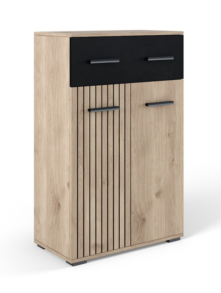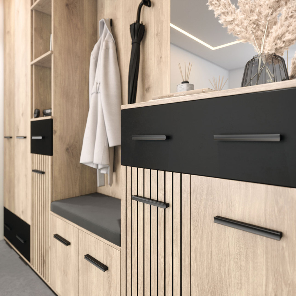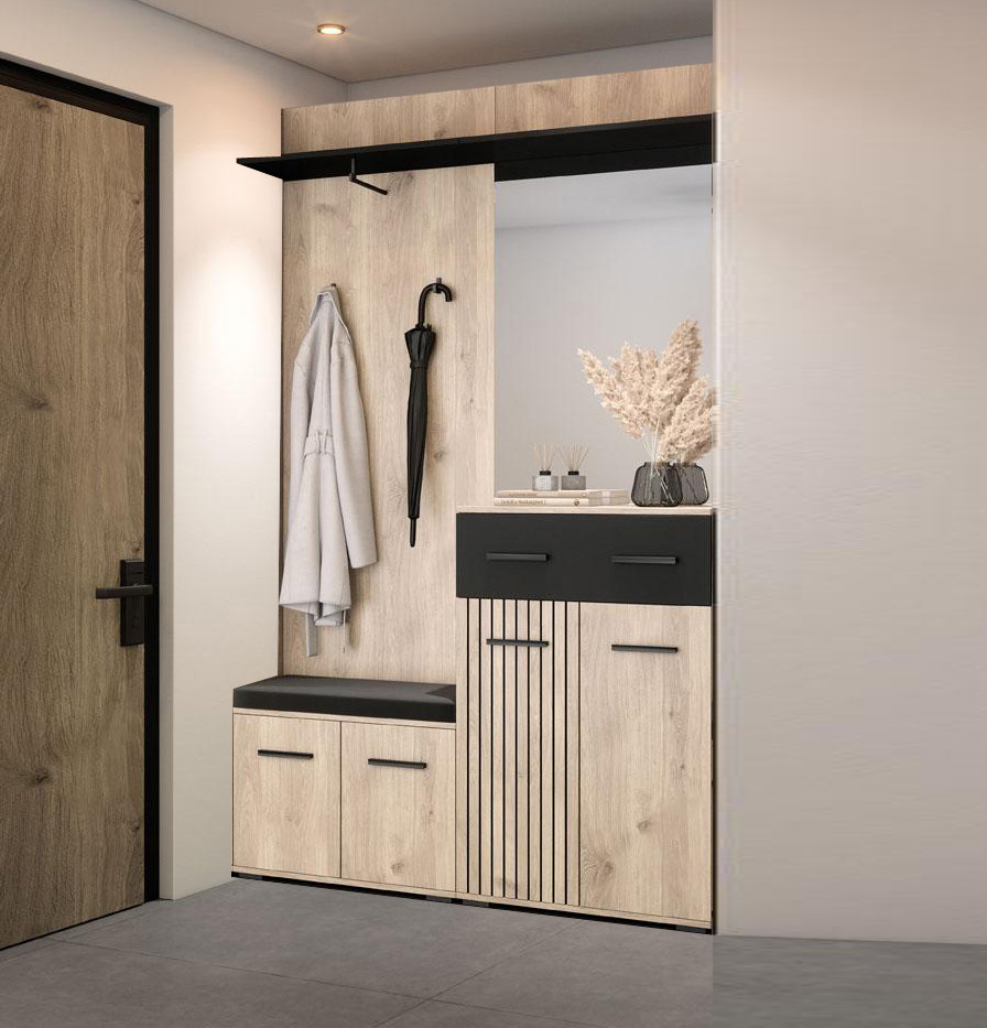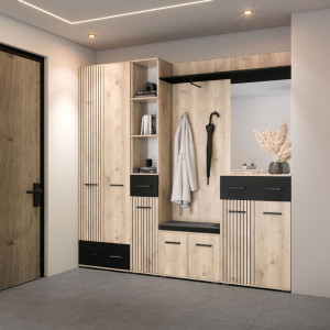 Dotaz na produkt Na splátky ještě dnesO stylový design Vaší vstupní části se postará moderní předsíňová sestava . Kombinace moderních barev a předních dvířek imitujících trendové lamely jí dodává jedinečný charakter. Za praktický rozměr sestavy jsou zodpovědné úložné prostory v podobě skříněk na boty a komody. Snadný přístup ke kabátům zabezpečují věšáky upevněné na věšákovém panelu.