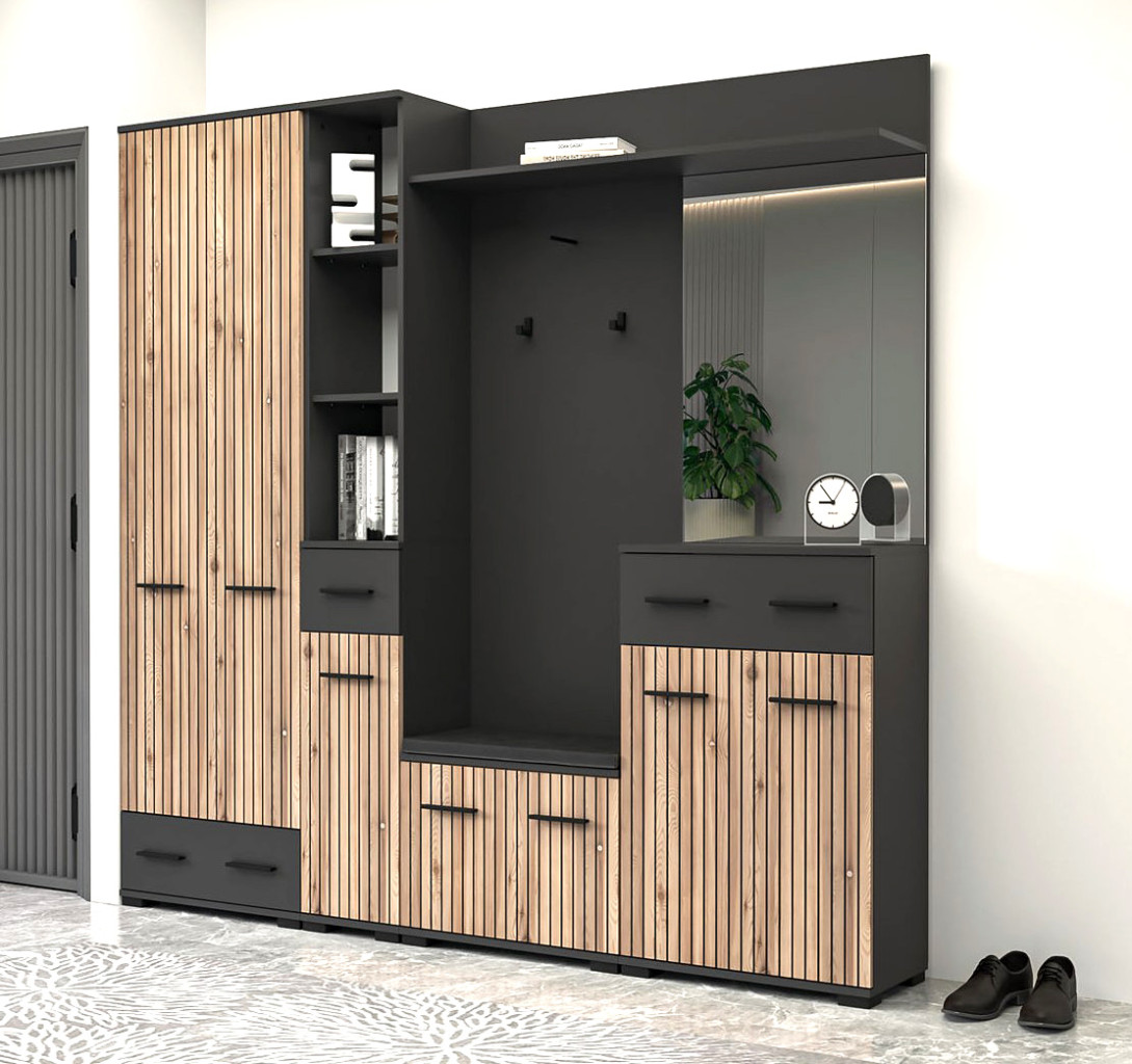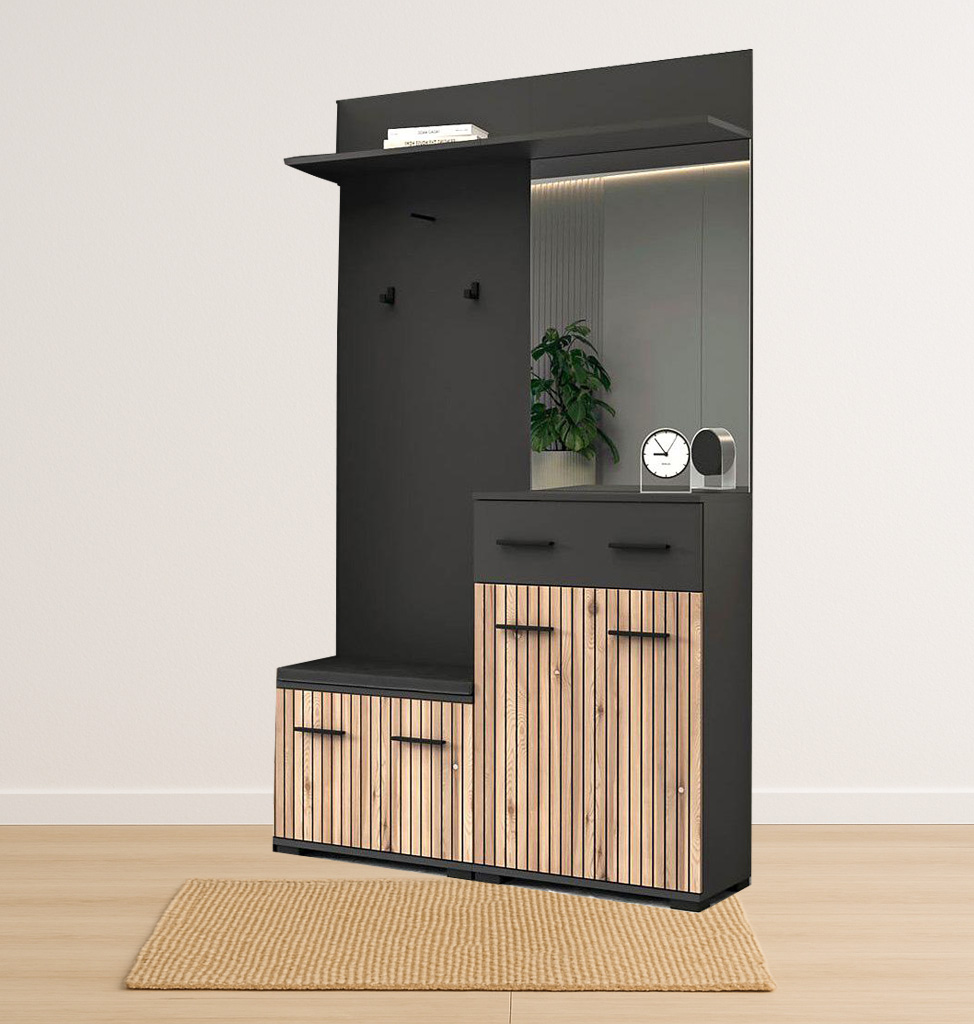 Dotaz na produkt Na splátky ještě dnesO stylový design Vaší vstupní části se postará moderní předsíňová sestava . Kombinace moderních barev a předních dvířek imitujících trendové lamely jí dodává jedinečný charakter. Za praktický rozměr sestavy jsou zodpovědné úložné prostory v podobě skříněk na boty či komody. Snadný přístup ke kabátům zabezpečují věšáky upevněné na věšákovém panelu.