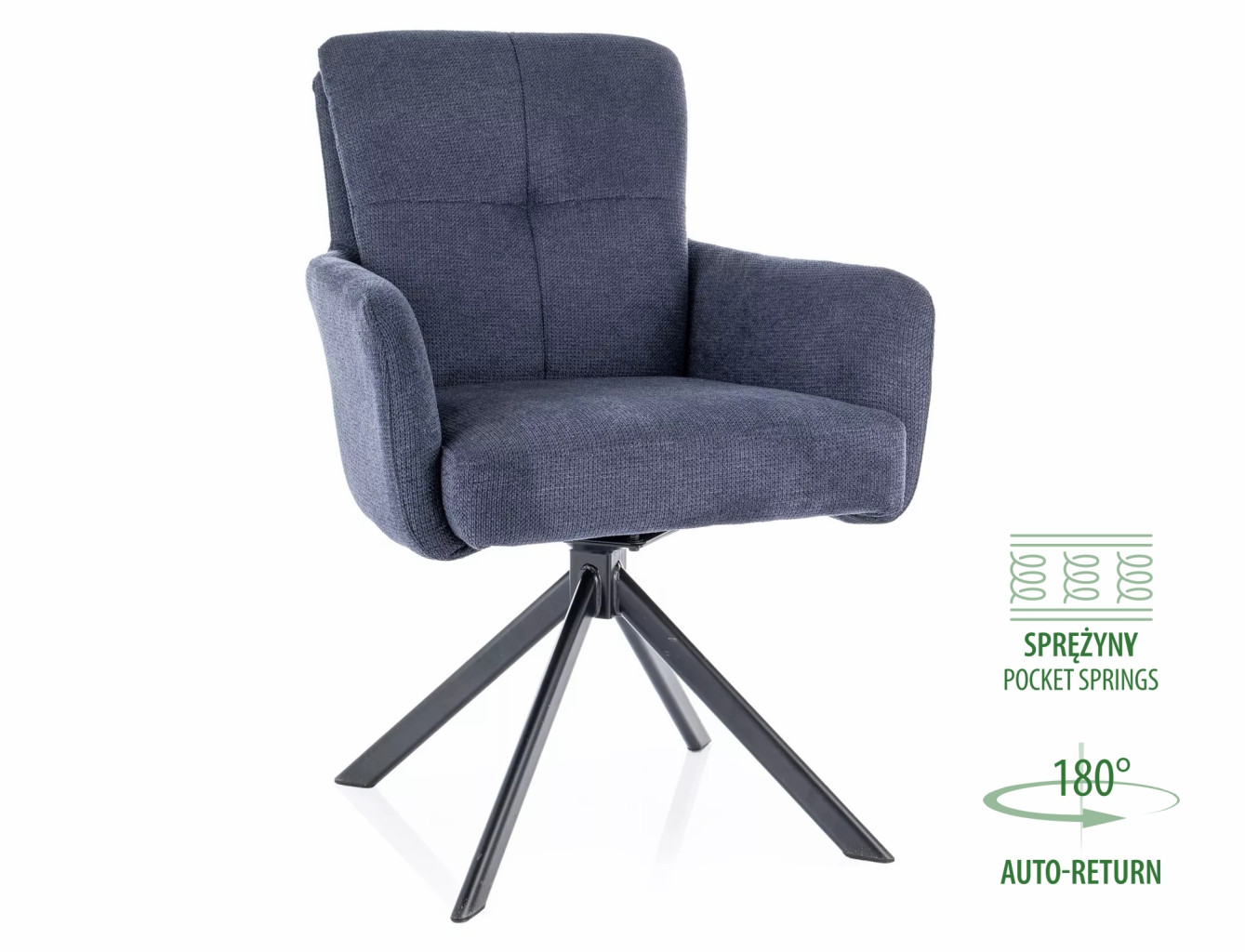 Dotaz na produkt Na splátky ještě dnesŽidle, čalounění: látka Vardo, rám: kov, barva: 89 inkoustově modrá / matná černá. Funkce automatického návratu - sedák otočný o 180 stupňů s funkcí návratu. Taštičkové pružiny v sedáku.