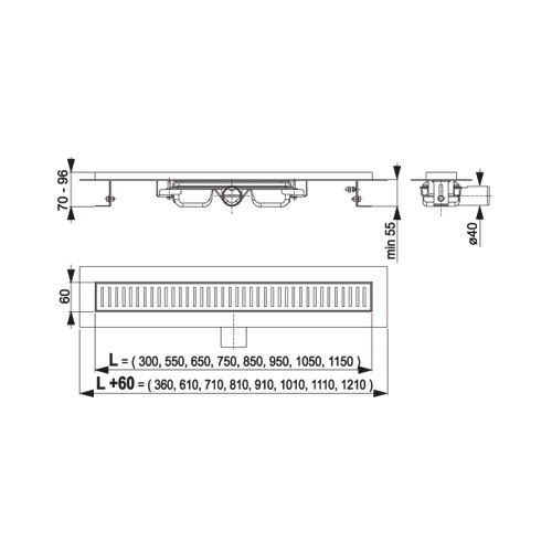 Požadavky na moderní koupelnu stále více směřují k čistotě tvarů, dokonalé funkčnosti a spolehlivosti... Podlahové žlaby ALCA vychází těmto trendům vstříc a nabízí ideální řešení pro váš sprchový kout. Zabudováním podlahového žlabu do sprchového koutu dosáhnete harmonického prostorového a výškového uspořádání vaší koupelny s důrazem na bezbariérový přechod z mokré do suché oblasti. Tento žlab je určen pro vkládání perforovaných roštů. Nerezový okraj tvoří pohledový přechod mezi dlažbou a vloženým roštem. Voda vtéká do žlabu přes okraje a otvory v roštu. Umísťuje se do prostoru nebo do blízkosti stěny. Parametry: - minimální tloušťka betonu: 55 mm - celková stavební výška: 70-96 mm - šířka koryta žlabu: 60 mm - průtok žlabu (ČSN EN 1253):35 l/min - odpadní potrubí: průměr 40 - třída zatížení (ČSN EN 1253): K3 - materiál – tělo žlabu (ČSN 17240): nerezová ocel DIN 1.4301 - materiál – zápachová uzávěra: PP - vhodné typy roštů: LINE, PURE, CUBE, HOPE, BUBLE, DREAM VÝHODY ŽLABŮ ALCA: - dokonale čistitelný sifon - nízká stavební výška (70 mm) - komplexní nabídka technického a designového řešení - velký výběr designů roštů - nadstandardní příslušenství - 25 let záruka Společnost Alca plast s.r.o. poskytuje zákonné i prodloužené záruční lhůty. Odbornou a profesionální montáží můžete výrazně ovlivnit funkčnost, užitnou hodnotu výrobku a tím samozřejmě spokojenost uživatele s daným produktem. Na podlahové žlaby Alca plast, nainstalované odbornou a proškolenou firmou, poskytuje firma prodlouženou záruční lhůtu 25 let!