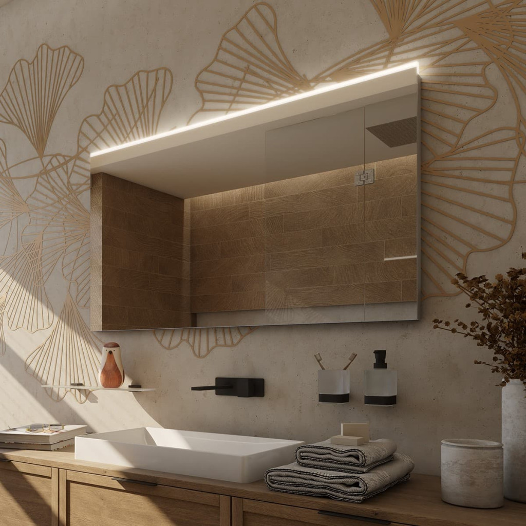 Nová technologie svícení za použití akrylátového skla – plexiglass. Konstrukce je z hliníkového rámu 32x19 mm, sklo zrcadla o tloušťce 5mm. Zrcadlo lze uchytit horizontálně a vertikálně. Připojení 220-240 V. Ochrana IP 44. Bez vypínače. Zapojení do el. rozvodu a zapínání přes vypínač světel v místnosti. LED čipy s vysokým výkonem. Barevná Teplota denní bílá – jasné polední světlo. Životnost LED diod je až 50 000 hodin.