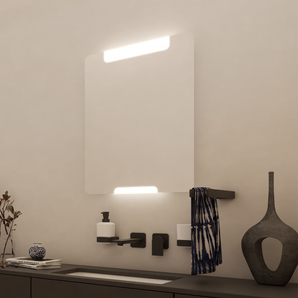 Nová technologie svícení za použití akrylátového skla – plexiglass. Konstrukce je z hliníkového rámu 32x19 mm, sklo zrcadla o tloušťce 5mm. Zrcadlo lze uchytit horizontálně a vertikálně. Připojení 220-240 V. Ochrana IP 44. Bez vypínače. Zapojení do el. rozvodu a zapínání přes vypínač světel v místnosti. LED čipy s vysokým výkonem. Barevná Teplota denní bílá – jasné polední světlo. Životnost LED diod je až 50 000 hodin.