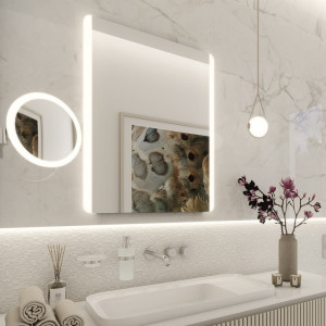 Nová technologie svícení za použití akrylátového skla – plexiglass. Konstrukce je z hliníkového rámu 32x19 mm, sklo zrcadla o tloušťce 5mm. Zrcadlo lze uchytit horizontálně a vertikálně. Připojení 220-240 V. Ochrana IP 44. Bez vypínače. Zapojení do el. rozvodu a zapínání přes vypínač světel v místnosti. LED čipy s vysokým výkonem. Barevná Teplota denní bílá – jasné polední světlo. Životnost LED diod je až 50 000 hodin.