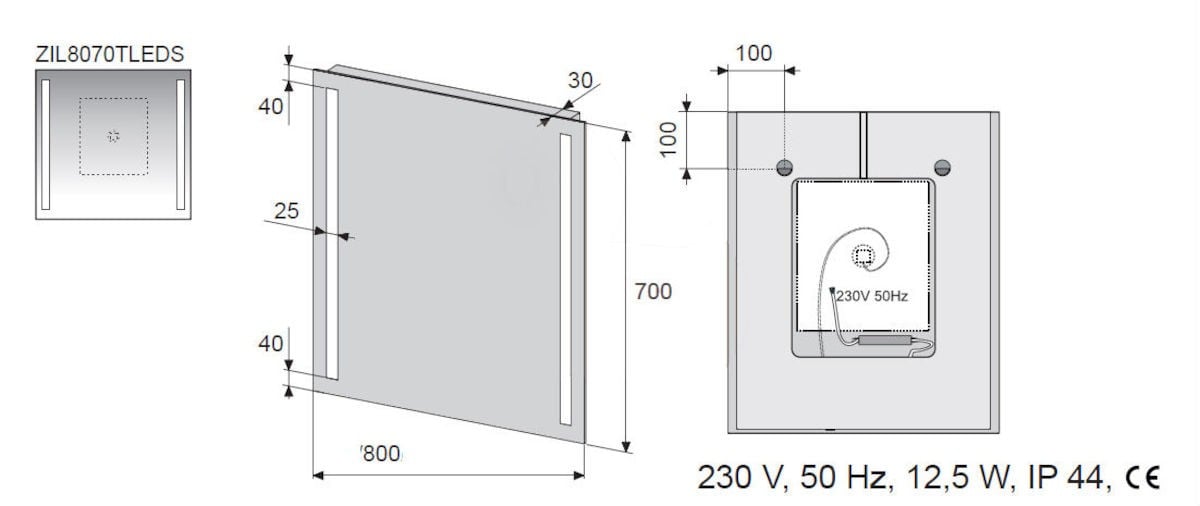 Dotaz na produkt Na splátky ještě dnesZrcadlo do koupelny v rozměrech 80x70 cm s LED osvětlením, senzorovým spínačem a vyhřívanou topnou folií, která brání zamlžení zrcadla - ideální do koupelny. V nabídce také varianta bez vyhřívané topné folie ZIL8070LEDS.230 V, 50 Hz, 12,5 W, IP 44, 6000K - studená bílá