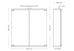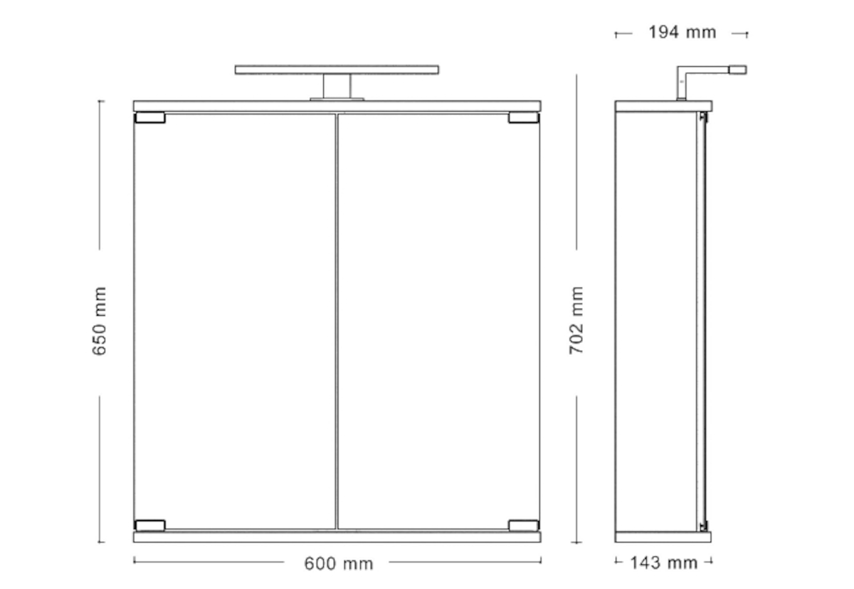 rozměry: šířka 60 cm, výška skříňky bez osvětlení 65 cm, včetně LED bodového osvětlení 69 cm, hloubka 14 cm