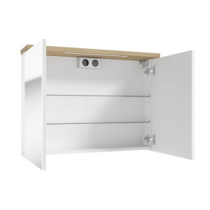 Zrcadlová skříňka je shora vybavena LED osvětlením s krytím IP44 proti stříkající vodě a zásuvkou na 220V. Police ukryté za dvířky pojmou nezbytné věci potřebné při ranní toaletě. Skříňka se zrcadlem je funkčním řešením pro udržení pořádku v koupelně.