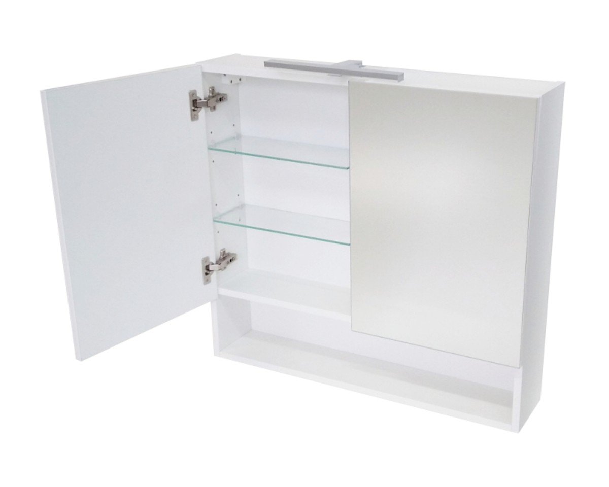 Dotaz na produkt Na splátky ještě dnesZrcadlová skříňka do koupelny ze série VARIO. Skříňka je připravena na instalaci lampičky s trafem jako jsou ESTHER či IRENE. Lampička není součástí dodávky. Galerka má za zrcadlovými dvířky 2 skleněné poličky. Barva bílá mat.
