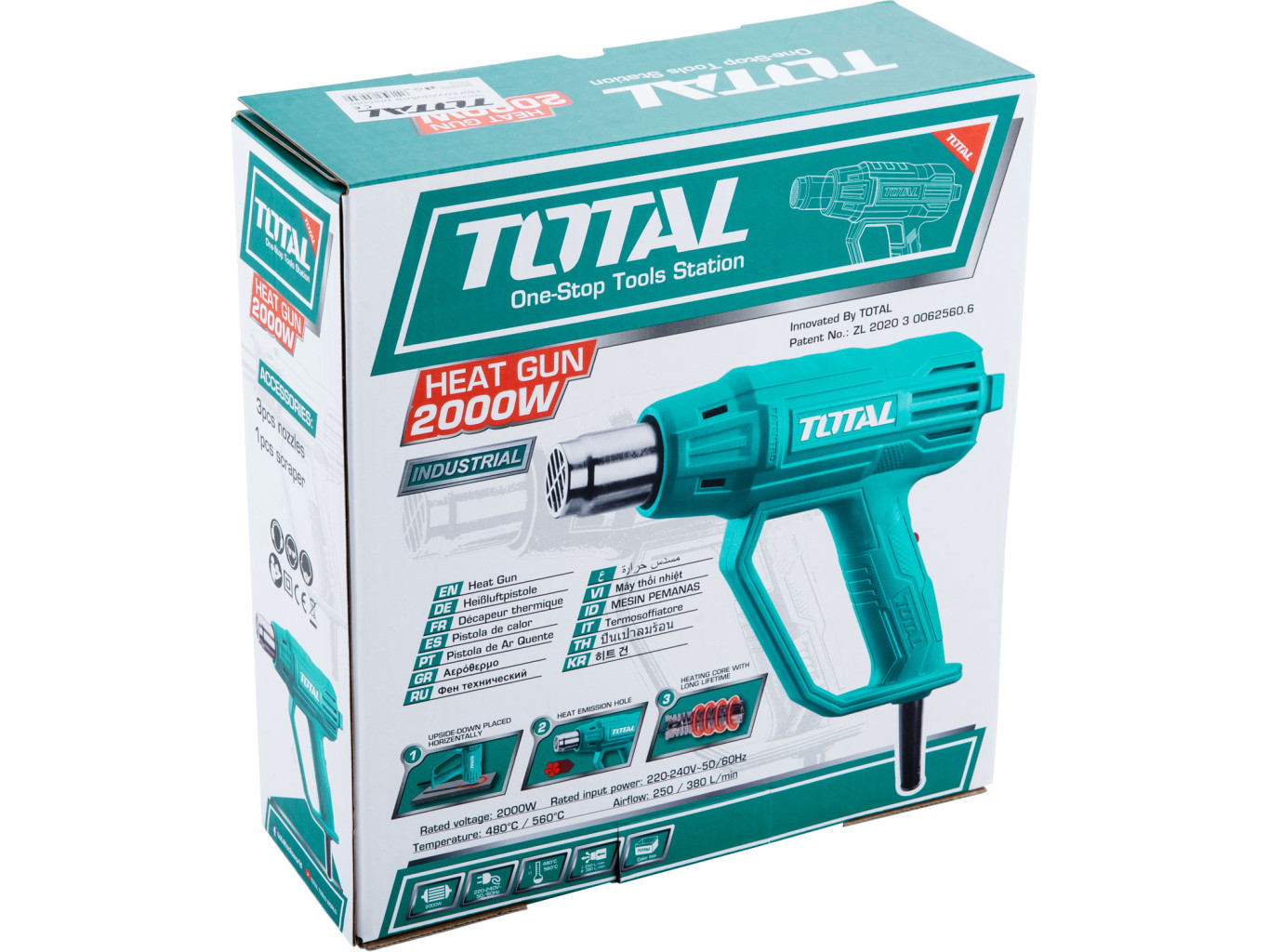 Dotaz na produktHorkovzdušná pistole je určena k nahřívání povrchů za účelem odstranění nátěrů (barev, laků), sušení čerstvě nanesených nátěrů, tvarování a spojování umělých hmot (např. trubek) a asfaltových krytin, uvolňování lepených spojů, pájení a také k rozmrazování zmrzlé vody v potrubí. Pistole umožňuje nastavit dva stupně lišící se teplotním rozsahem a průtokem vzduchu. Díky regulátoru teploty lze měnit teplotu v rámci nastaveného stupně. Pistole má výfuk z nerezové oceli, příkon 2000W, 2 stupně teploty 350/550 stupňů celsia a 2 stupně proudění vzduchu 300/500l/min. Je dodávána se 4 kusy nástavců a 1ks škrabky. S váhou pouhých 1,2kg, celopogumovanou protiskluzovou rukojetí a design TOTAL se Vám stane nepostradatelným pomocníkem při práci.