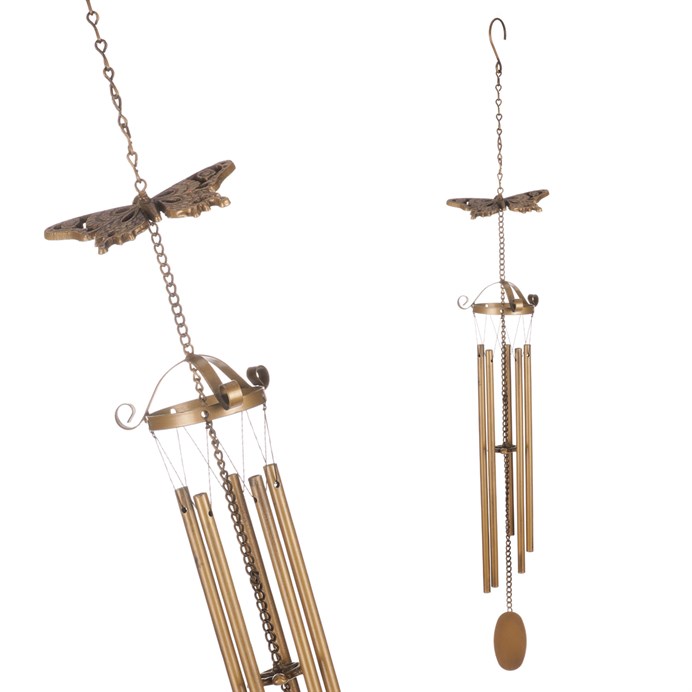 Dotaz na produktZvonkohra vytváří při pohybu větru jemnou melodii a tím napomáhá obohatit okolní prostředí o příjemný zvukový efekt. Konstrukce je tvořena jemnými kovovými trubičkami zavěšenými na provázku. Díky tomu při závanu větru do sebe naráží a vytváří tím onen líbivý zvuk. Konkrétně tato je navíc ozdobena siluetou motýla a je v krásné měděné barvě. V některých případech může zvonkohra plnit i užitečnou funkci tím, že odežene nezvané návštěvníky v podobě ptáků či jiných živočichů, kteří by si jinak třeba pochutnali na naší úrodě. Zvonkohru můžeme díky háčku na řetízku zavěsit na hřebíček v pergole, altánku, nebo za jakoukoli vhodnou větev poblíž.