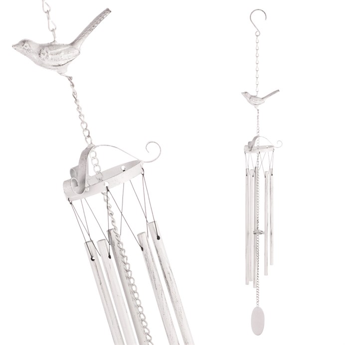 Dotaz na produktZvonkohra vytváří při pohybu větru jemnou melodii a tím napomáhá obohatit okolní prostředí o příjemný zvukový efekt. Konstrukce je tvořena jemnými kovovými trubičkami zavěšenými na provázku. Díky tomu při závanu větru do sebe naráží a vytváří tím onen líbivý zvuk. Konkrétně tato je navíc ozdobena siluetou ptáčka a je v krásné bílé barvě. V některých případech může zvonkohra plnit i užitečnou funkci tím, že odežene nezvané návštěvníky v podobě ptáků či jiných živočichů, kteří by si jinak třeba pochutnali na naší úrodě. Zvonkohru můžeme díky háčku na řetízku zavěsit na hřebíček v pergole, altánku, nebo za jakoukoli vhodnou větev poblíž.